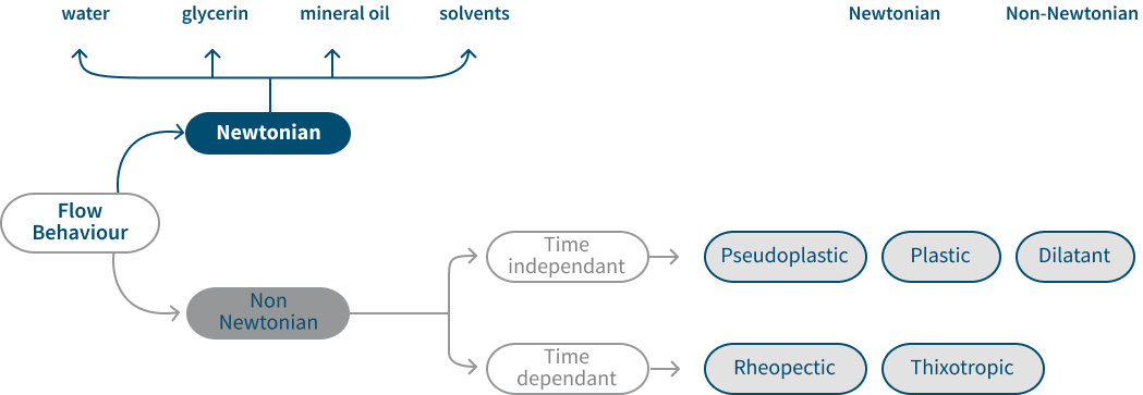According to Newton’s law, the viscosity of a fluid is constant. As shear rate changes, shear stress changes in proportion such that viscosity is constant. Common fluids that exhibit such behavior are:
